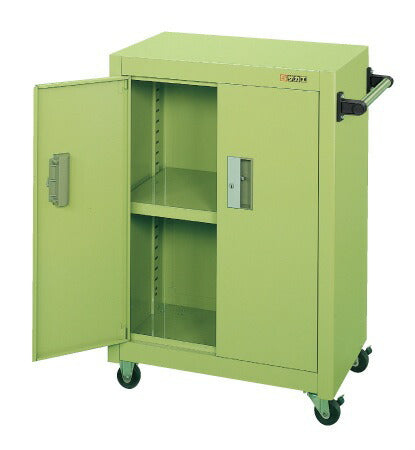 <<商品スペック>> ●外寸:W605×D405×H880mm ●カラー:サカエグリーン ●均等耐荷重:150kg ●質量:28kg ●キャスター:75φゴム車