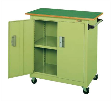 <<商品スペック>> ●外寸:W900×D600×H900mm ●均等耐荷重:200kg ●本体色:サカエグリーン ●質量:41kg ●キャスター:75φゴム車 ●天板種類:サカエリューム天板 ●天板カラー:グリーン