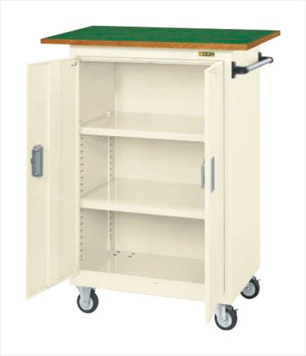 <<商品スペック>> ●外寸:W900×D600×H1220mm ●均等耐荷重:200kg ●本体色:アイボリー ●質量:54kg ●キャスター:100φゴム車 ●天板種類:サカエリューム天板 ●天板カラー:グリーン