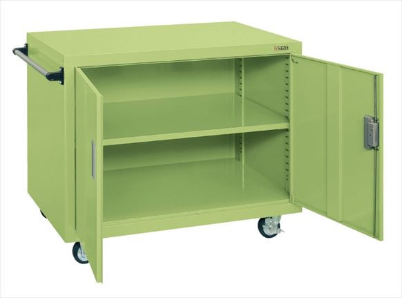 <<商品スペック>> ●外寸:W1100×D650×H880mm ●カラー:サカエグリーン ●均等耐荷重:300kg ●質量:62kg ●キャスター:100φゴム車