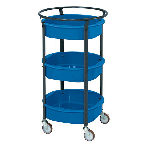 カドが無く人に優しいまるいワゴン!!タテ・ヨコの向きが無く、どこからでも握れて使いやすい!絞り加工の一体構造により油漏れのない棚板を採用。