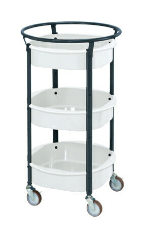 カドが無く人に優しいまるいワゴン!!タテ・ヨコの向きが無く、どこからでも握れて使いやすい!絞り加工の一体構造により油漏れのない棚板を採用。