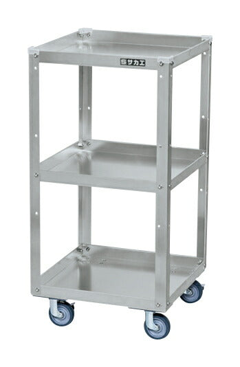 見た目にも美しいアルミ製のワゴンです。スチール製に比べ軽く、使い勝手の良いワゴンです。棚板は皿型・フラット型変更可能です。