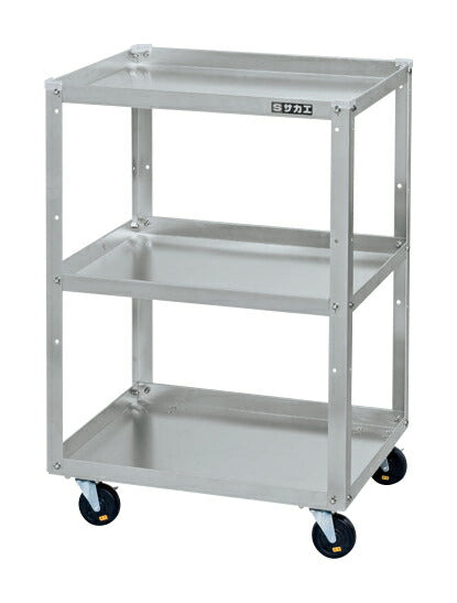 見た目にも美しいアルミ製のワゴンです。スチール製に比べ軽く、使い勝手の良いワゴンです。棚板は皿型・フラット型変更可能です。