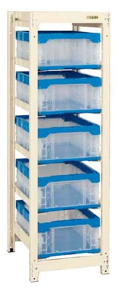 コンテナラックケースに各種コンテナを備えた、基本的なセットの組み合わせです。棚板1段につき均等耐荷重100kgと、スチール棚なみの強度です。