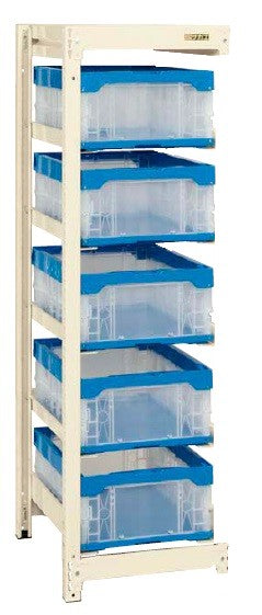 コンテナラックケースに各種コンテナを備えた、基本的なセットの組み合わせです。棚板1段につき均等耐荷重100kgと、スチール棚なみの強度です。