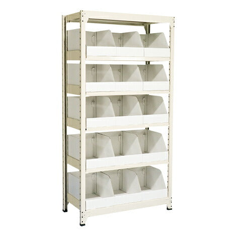<<商品スペック>> ●寸法:W900×D450×H1800mm ●段数:5段 ●耐荷重(棚1段当り):150kg ●耐荷重(棚1連当り):750kg ●本体色:アイボリー ●段ボール仕切ケース:小15個 ●段ボール仕切ケース寸法:W280×D430×H240mm