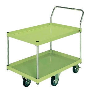 <<商品スペック>> ●外寸:W900×D600×H860mm ●段数:2段 ●カラー:サカエグリーン ●均等積載荷重:200kg ●質量:17kg ●キャスター:100φゴム車(ストッパー付2個)