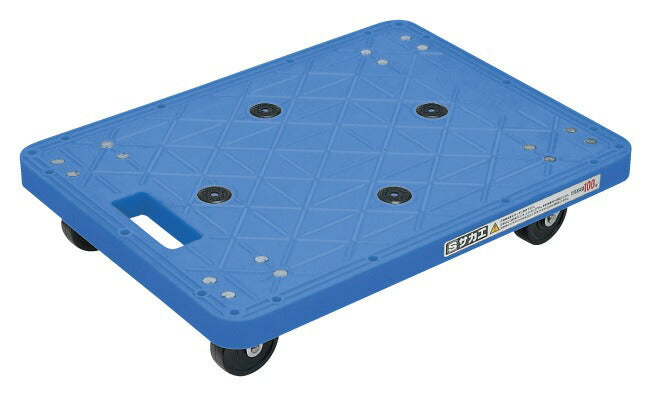 <<商品スペック>> ●外寸:W500×D370×H104mm ●均等積載荷重:100kg ●カラー:ブルー ●質量:2kg ●材質:PP樹脂(ポリプロピレン) ●キャスター:65φゴム