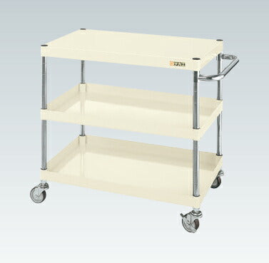 ●ボルトレスで組立簡単。棚板を逆さにするだけで、皿型・フラット型と組み替えることができます。油に強く床面に跡がつきにくいナイロンウレタン車を採用。