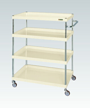 ●ボルトレスで組立簡単。棚板を逆さにするだけで、皿型・フラット型と組み替えることができます。油に強く床面に跡がつきにくいナイロンウレタン車を採用。移動時の直進性をサポートする直進安定金具付。