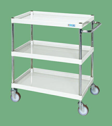 ●ボルトレスで組立簡単。棚板を逆さにするだけで、皿型・フラット型と組み替えることができます。油に強く床面に跡がつきにくいナイロンウレタン車を採用。