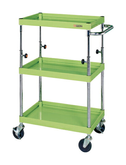●ボルトレスで組立簡単。棚板を逆さにするだけで、皿型・フラット型と組み替えることができます。安価で耐久性に優れるゴム車を採用。作業用途に応じてワゴンの高さを調整できます。