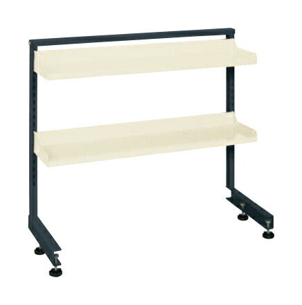 何色にも合うツートン色の架台。オプション架台を取り付ける事で省スペースに貢献、また作業者の効率アップ。架台は取付け位置を天板の100mm後ろまで下げることが可能で、作業スペースを有効に使えます。