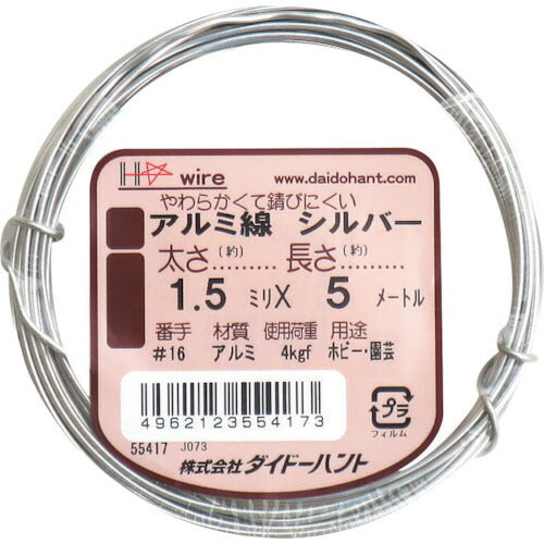 商品名:ダイドーハント アルミ線 シルバー 1.5mmx5m (株)ダイドーハント コードNo: 10155417 オレンジブック発注コード:134-8142 JANコード:4962123554173
