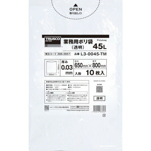 商品名:TRUSCO 業務用ポリ袋0.03X120L(透明)10枚入り トラスコ中山(株) コードNo: L3-0120-TM オレンジブック発注コード:396-3959 JANコード:4550414363674